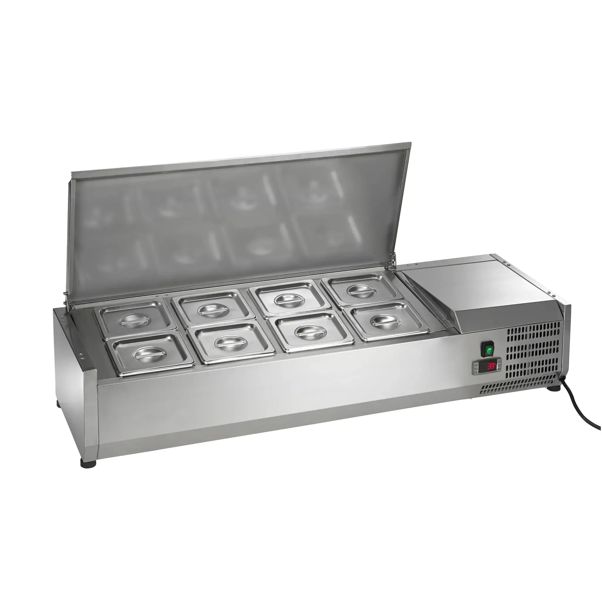 Chill with fine craftsmanship. Introducing the Arctic Air ACP48 Refrigerated Countertop Pan Rail, a must-have for any commercial restaurant. This refrigerated prep unit is designed to keep your ingredients fresh and easily accessible. With a temperature range of 33F to 41F, you can trust that your food will stay at the perfect temperature for optimal freshness. The electronic thermostat with an external digital LED display allows for precise temperature control, ensuring your ingredients are always stored at the right conditions. The stainless steel construction not only adds durability but also gives a sleek and professional look to your kitchen. The unit comes with eight 1/6 stainless pans and covers, providing ample space for all your ingredients. With its self-contained capillary tube refrigeration system and R290 Hydrocarbon refrigerant, this unit is not only efficient but also environmentally friendly. Upgrade your restaurant's food preparation with the Arctic Air ACP48 Refrigerated Countertop Pan Rail.