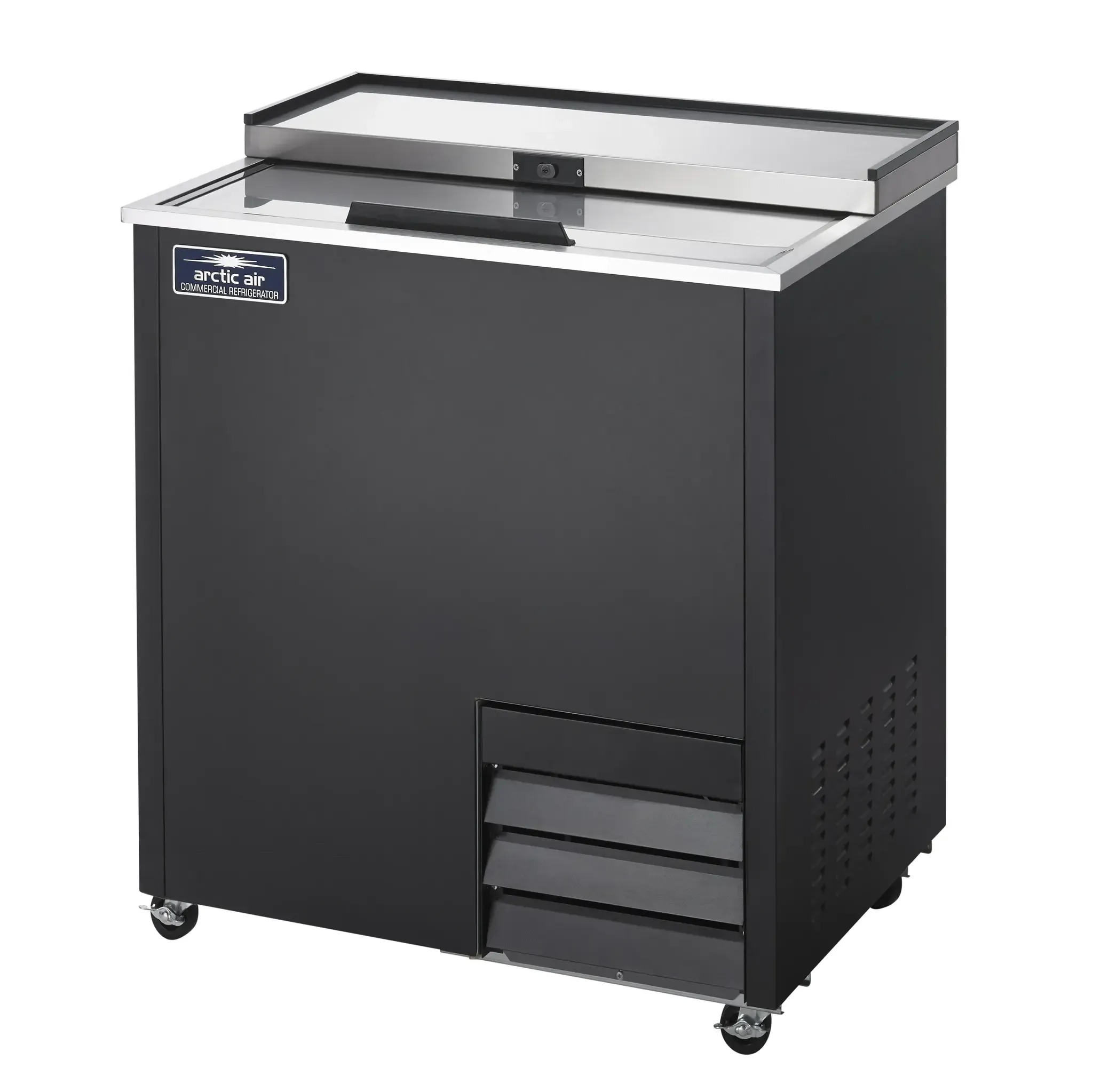 Infuse efficiency and elegance into your commercial restaurant with the Arctic Air AGF24 Glass Froster. This sleek and reliable glass froster is designed to meet the demands of a busy restaurant environment. With its self-contained refrigeration system and electronic thermostat with LED display, you can easily control and maintain the perfect temperature for chilling glasses. The stainless steel sliding lid with a lock ensures the security of your glassware while the three epoxy coated shelves provide ample storage space. The stainless steel interior and black exterior color not only add a touch of sophistication but also make cleaning a breeze. Equipped with four casters, including two locking ones, this glass froster is easy to move and position wherever you need it. Trust Arctic Air, the leading vendor in glass frosters, to deliver a high-quality product that enhances the efficiency and aesthetics of your restaurant.