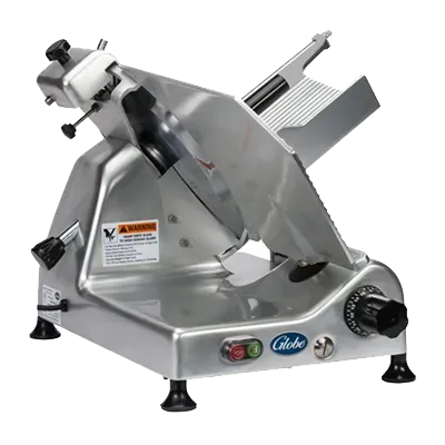 Introducing the Globe G14 Electric Food Slicer, a powerful addition to your commercial kitchen that will help you dominate the culinary world. With its 14" diameter knife and extended chute, this manual slicer can easily accommodate products up to 10-1/2" in height. The pyramid-shaped end weight with gripping teeth ensures a secure grip on your ingredients, while the top-mounted all-metal sharpener keeps the knife razor-sharp for precise slicing every time. The anodized aluminum construction and knife ring guard guarantee durability and safety. With a 1/2 HP motor and 4.0 amps, this slicer delivers reliable performance, making it perfect for high-volume restaurant use. NSF certified and cETLus listed, this Globe G14 slicer meets the highest industry standards. Upgrade your kitchen with this efficient and reliable food slicer and take your culinary creations to the next level.