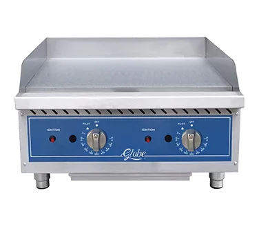Master the art of flavor with the Globe GG24TG Gas Countertop Griddle. This 24" wide griddle is designed to meet the demands of a commercial restaurant kitchen. Its 1" highly polished griddle plate is fully welded to a stainless steel frame, ensuring durability and even heat distribution. The thermostatic controls, located every 12", allow for precise temperature adjustments, while the individual adjustable pilots with front access make ignition quick and easy. The 4" wide grease trough helps to keep the cooking surface clean and the stainless steel double wall construction with an extended cool-to-touch front edge ensures safety. With 60,000 total BTUs, this griddle delivers powerful performance. The GG24TG comes with a conversion kit, allowing for easy transition between natural gas and LP. Complete with adjustable heavy-duty stainless steel legs, this Globe griddle is a reliable and versatile addition to any commercial kitchen.