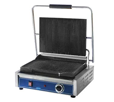 Realize kitchen dreams with the Globe GPG1410 Sandwich / Panini Grill. This commercial-grade grill is a must-have for any restaurant looking to elevate their sandwich game. With its seasoned cast iron grooved griddle plates, this grill ensures even heat distribution and perfect grill marks on every sandwich. The stainless steel construction not only adds durability but also gives a sleek and professional look to your kitchen. The heavy-duty hinge allows for easy opening and closing, while the adjustable stainless steel non-skid feet ensure stability during use. The catch tray conveniently collects any excess grease or crumbs, making cleanup a breeze. With 1800 watts of power, this grill heats up quickly and efficiently, allowing you to serve up delicious sandwiches in no time. Trust Globe, a reputable vendor in the industry, and invest in the GPG1410 Sandwich / Panini Grill for your restaurant's success.