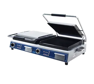 Elevate your dining experience with the Globe GSGDUE14D Sandwich/Panini Grill. This double countertop electric grill is designed to meet the demands of a commercial restaurant. With its cast iron smooth plates, you can achieve perfectly grilled sandwiches and paninis every time. The electronic timer with four programmable presets allows for precise cooking, while the temperature control up to 570 degrees ensures optimal results. The spring hinge with adjustable tension provides even pressure for consistent grilling. Made with stainless steel construction, this grill is durable and easy to clean. The stainless steel removable catch tray and rubber feet add convenience and stability. With 5400/7200 watts of power, this grill is ready to handle high-volume cooking. Trust Globe, a reputable vendor in the industry, and invest in the GSGDUE14D Sandwich/Panini Grill for your restaurant's success.
