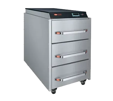 Boost your restaurant's performance with the Hatco CDW-3N Drawer Warmers. This narrow three-drawer unit is designed to keep your food at the perfect temperature until it's ready to be served. The programmable digital electronic controller allows you to easily set and monitor the temperature, ensuring that your dishes are always kept at the ideal heat. The low velocity convected air system evenly distributes heat throughout the drawers, preventing hot spots and ensuring consistent warming. The heavy-duty drawer slides on nylon rollers make it easy to access your food pans, while the angled solid chrome handles provide a comfortable grip. Each unit comes with three full-size 6" deep food pans, giving you plenty of space to store and organize your dishes. With its compact size and 2" casters, this drawer warmer is easy to move and position in your kitchen. Made in the USA and certified by cULus and UL EPH Classified, this Hatco drawer warmer is a reliable and efficient addition to any commercial restaurant.