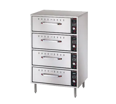 Craft culinary wonders with the Hatco HDW-4 Drawer Warmers. This free-standing warming drawer unit is designed to meet the demands of a commercial restaurant kitchen. With four spacious drawers, each equipped with a standard 6" deep food pan, you can easily keep your dishes warm and ready to serve. The stainless steel construction ensures durability and easy cleaning, while the thermostatic controls allow you to adjust the temperature to suit your needs. The 6" legs provide stability and make it easy to clean underneath the unit. Made in the USA and NSF and cULus certified, you can trust the quality and safety of this Hatco product. Whether you're keeping appetizers, sides, or desserts warm, the Hatco HDW-4 Drawer Warmers are the perfect addition to any commercial kitchen.