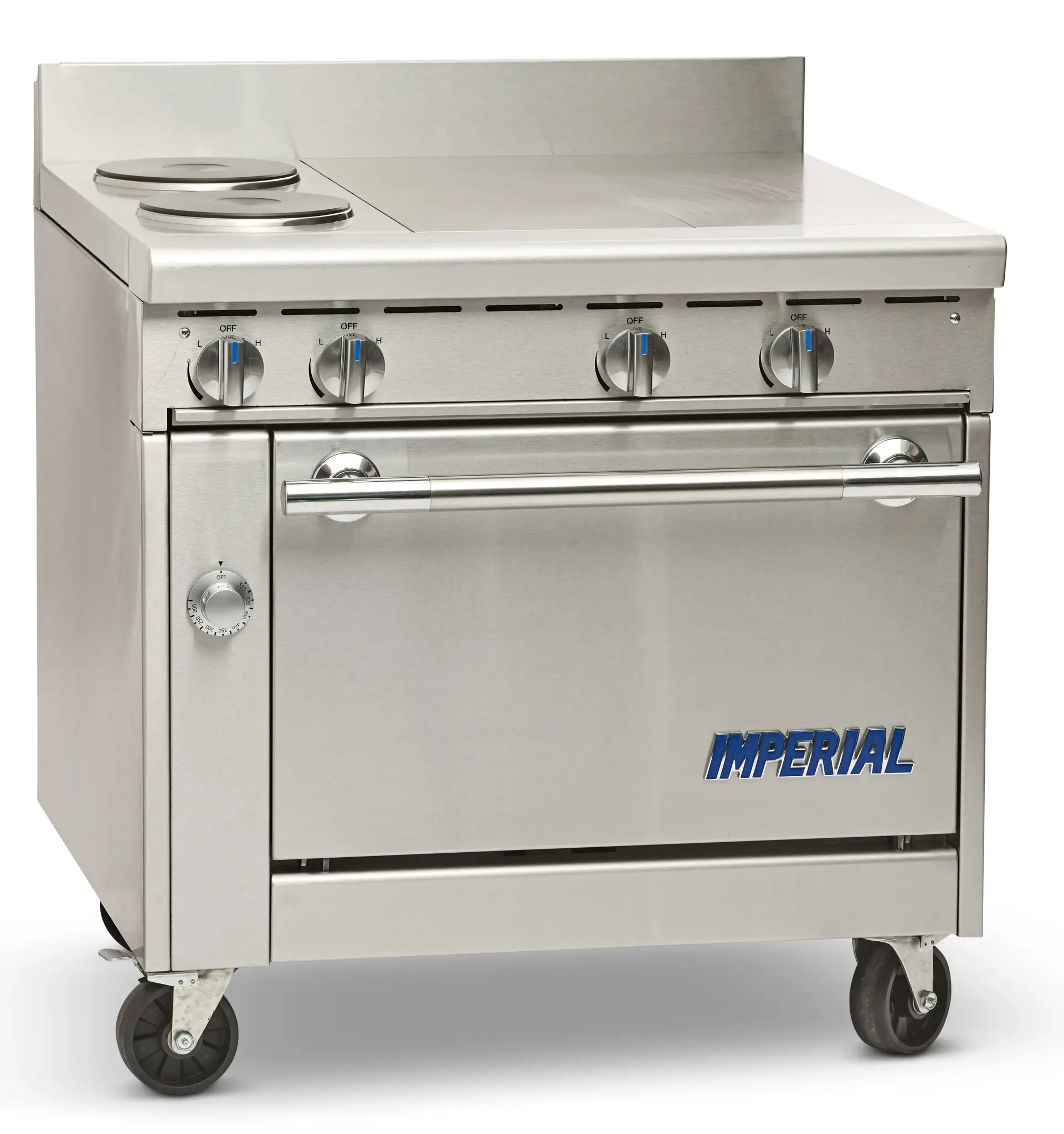 Unleash culinary creativity with the Imperial IHR-GT24-2-E-M Range, a heavy-duty electric range designed to elevate your restaurant's cooking capabilities. This 36" modular range features two round elements and a 24" thermostatic griddle, allowing you to effortlessly prepare a variety of dishes simultaneously. The 4" grease trough, along with the removable grease can and crumb tray, ensures easy cleanup, saving you valuable time in a busy kitchen. Crafted with a stainless steel front, sides, backguard, and landing ledge, this range not only offers durability but also adds a sleek and professional touch to your restaurant's aesthetic. With cETLus, ETL-Sanitation, and CE certifications, you can trust in the safety and reliability of this Imperial range. Upgrade your restaurant's cooking equipment with the Imperial IHR-GT24-2-E-M Range and experience the difference in efficiency and performance.