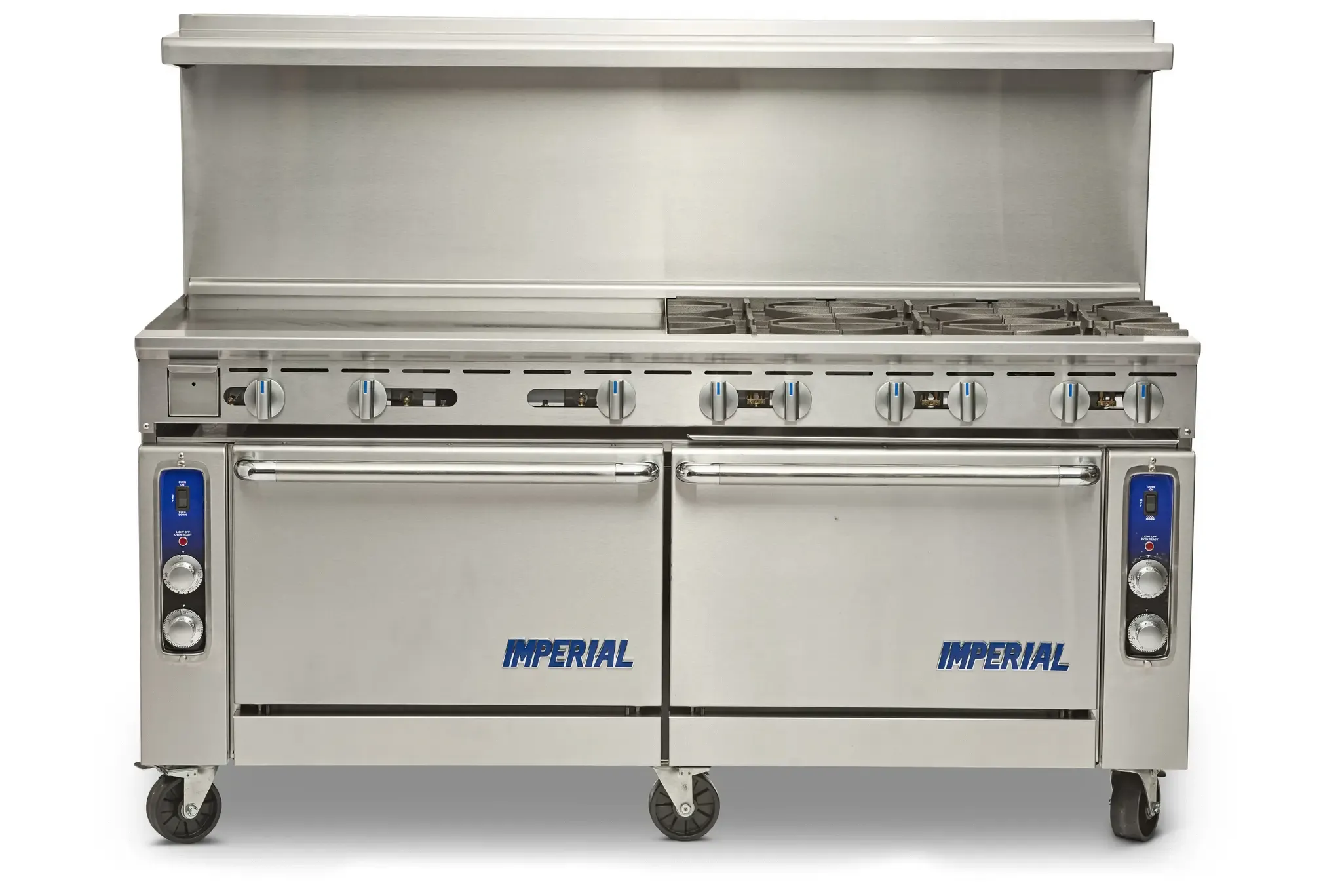 Master the art of flavor with the Imperial IR-2-G60-CC Range. This 72" gas restaurant range is designed to meet the demands of a busy commercial kitchen. With two open burners, a 60" griddle, and two convection ovens, this range offers versatility and efficiency. The three chrome racks per oven provide ample space for cooking multiple dishes at once. The 3" grease trough, removable grease pan, and crumb tray make cleaning a breeze, ensuring a hygienic cooking environment. Made with stainless steel front, sides, backguard, shelf, landing ledge, and kick plate, this range is built to withstand the rigors of a professional kitchen. The adjustable feet and 6" legs provide stability and flexibility. With a powerful 224,000 BTU output and NSF, CE, CSA Flame, and CSA Star certifications, this range is a reliable and high-performance addition to any commercial restaurant.
