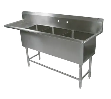 Each of the three compartments measures 20W x 20 front-to-back x 14 deep, ensuring you have plenty of room to handle large volumes of dishes, pots, and pans. The inclusion of a 24" left drainboard offers additional workspace, making it easier to manage wet dishes and utensils. The 10" high boxed backsplash with a 45° top and 2" return helps keep your kitchen clean by preventing water splashes.