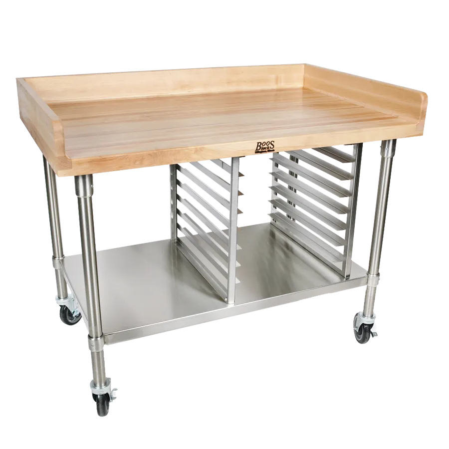 Transform your service with cutting-edge solutions using the John Boos BAK04 Work Table, Bakers Top. This bakery prep table is designed to enhance efficiency and productivity in your commercial restaurant. With a generous 48W x 36D x 39H overall size, it provides ample space for all your baking needs. The 1-3/4 inch thick edge grain top with a 4 coved riser on the back and both ends ensures durability and easy cleaning. Made from antimicrobial Northern Hard Rock Maple, this table promotes a hygienic environment. The stainless steel fixed undershelf offers additional storage space, while the bun pan rack can hold up to 8 18 x 26 pans. Equipped with 5 heavy-duty casters, including 2 with locks, this table is easy to maneuver and secure in place. NSF and CSA-Sanitation certified, this John Boos work table is a reliable and essential addition to any commercial bakery.