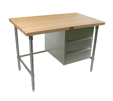 Maximize convenience using efficient tools with the John Boos BTNS02 Work Table. This work table is designed to meet the demands of a commercial restaurant setting, offering a spacious 60W x 30D x 35-14H overall size. The 1-3/4 inch thick edge grain top is made from antimicrobial Northern Hard Rock Maple, providing a durable and hygienic surface for food preparation. With a penetrating oil finish, the wood top is protected and easy to clean. The open cabinet base features three drawers, allowing for convenient storage of utensils, tools, and other essentials. Stainless steel bracings, legs, and bullet feet ensure stability and durability, even in a busy kitchen environment. NSF certified and KD (knocked down) for easy assembly, this work table from John Boos is a reliable and practical addition to any commercial restaurant.