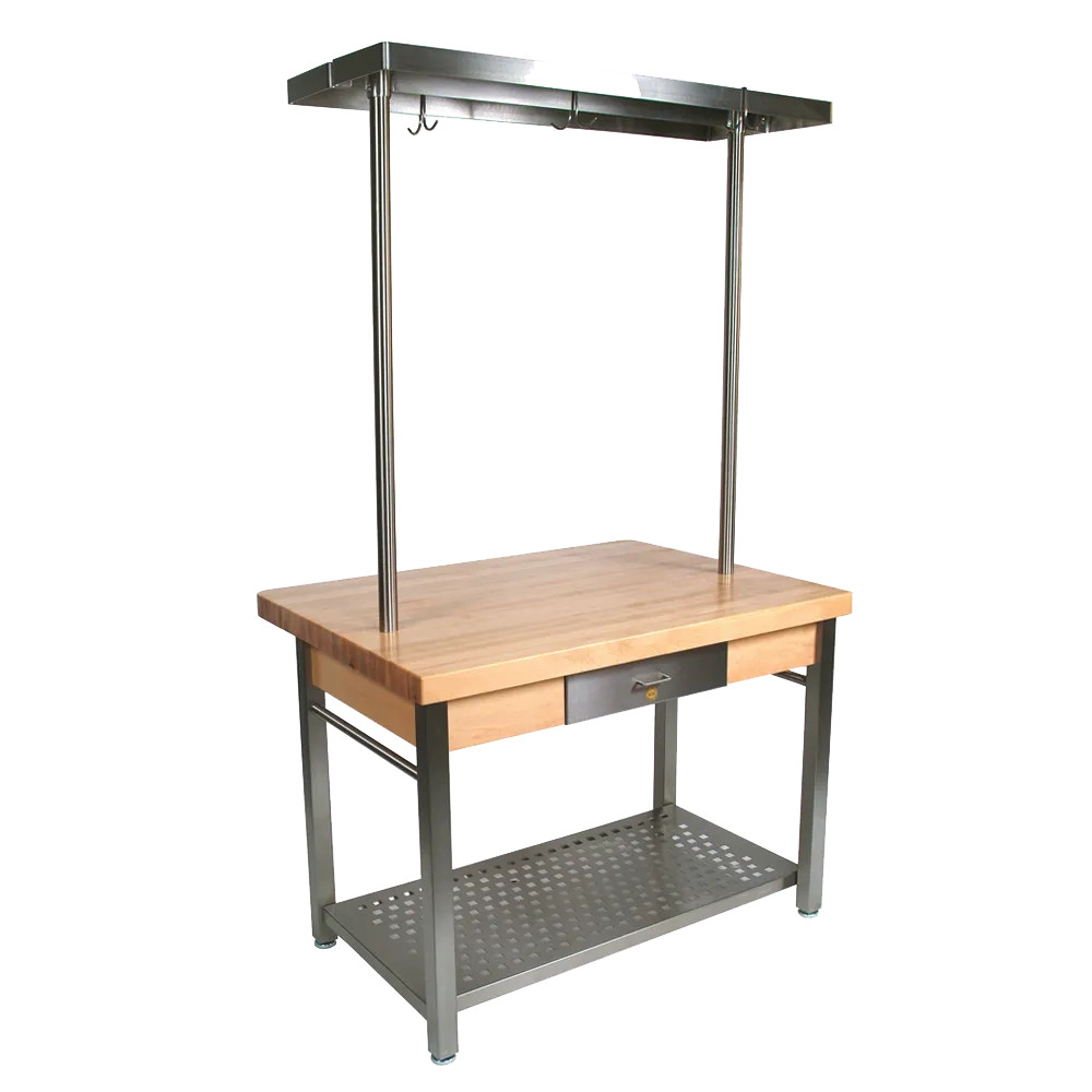 Upgrade your restaurant service with the John Boos CUCG21 Work Table. This versatile table is designed to meet the demands of a commercial restaurant setting. With its 60W x 28D x 35H overall size, it provides ample space for food preparation and plating. The 2-1/4 inch thick edge grain flat top, made from Northern Hard Rock Maple with a Varnique finish, offers durability and a beautiful aesthetic. The perforated 18300 stainless steel undershelf provides additional storage space for utensils and ingredients. The table also features a stainless steel front dovetailed drawer and two stainless steel towel bars for added convenience. With adjustable feet, you can easily level the table on any surface. Upgrade your restaurant's efficiency and style with the John Boos CUCG21 Work Table.