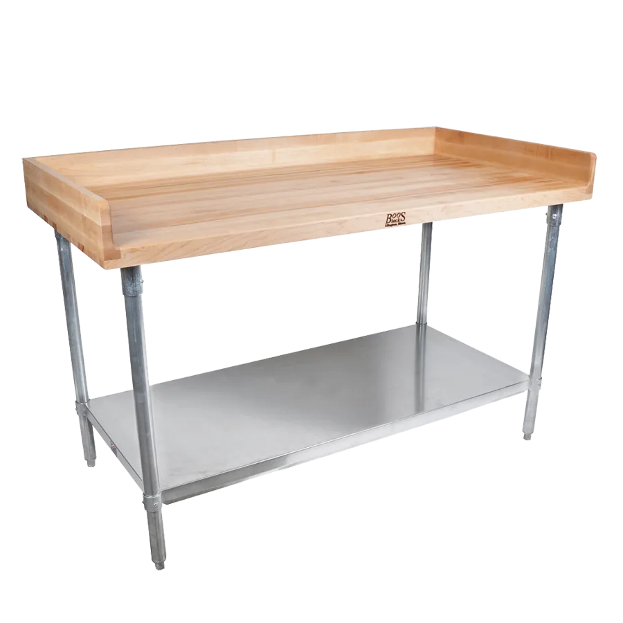 Optimize efficiency with versatile solutions using the John Boos DNS03 Work Table, Bakers Top. This commercial-grade work table is designed to enhance productivity in any restaurant setting. With a spacious 72W x 24D bakers top, it provides ample space for food preparation, baking, and other culinary tasks. The 1-3/4 inch thick top, made from antimicrobial Northern Hard Rock Maple, ensures durability and hygiene. The table also features a 4 coved riser on the back and both ends, preventing spills and messes from reaching the floor. The galvanized adjustable undershelf, legs, and bullet feet offer stability and storage options. NSF certified, this work table meets the highest standards of cleanliness and safety. Whether you're running a bakery, a pizzeria, or a busy restaurant kitchen, the John Boos DNS03 Work Table, Bakers Top is the perfect addition to streamline your operations and elevate your culinary creations.