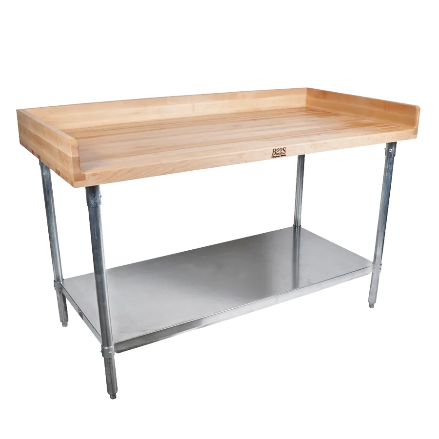 Revamp operations with flexible choices using the John Boos DSS08A Work Table, Bakers Top. This versatile work table is designed to enhance efficiency and productivity in commercial restaurant settings. With its 84-inch width and 30-inch depth, it provides ample space for food preparation, baking, and other culinary tasks. The 1-3/4 inch thick top, made of antimicrobial Northern Hard Rock Maple, ensures durability and hygiene. The table also features a 4-inch coved riser on the back and both ends, preventing spills and messes from spreading. Adjustable stainless steel undershelf, legs, and bullet feet offer customizable storage and stability. NSF certified, this work table meets the highest standards of cleanliness and safety. Whether you're running a bakery, restaurant, or catering service, the John Boos DSS08A Work Table, Bakers Top is a reliable and practical addition to your kitchen.