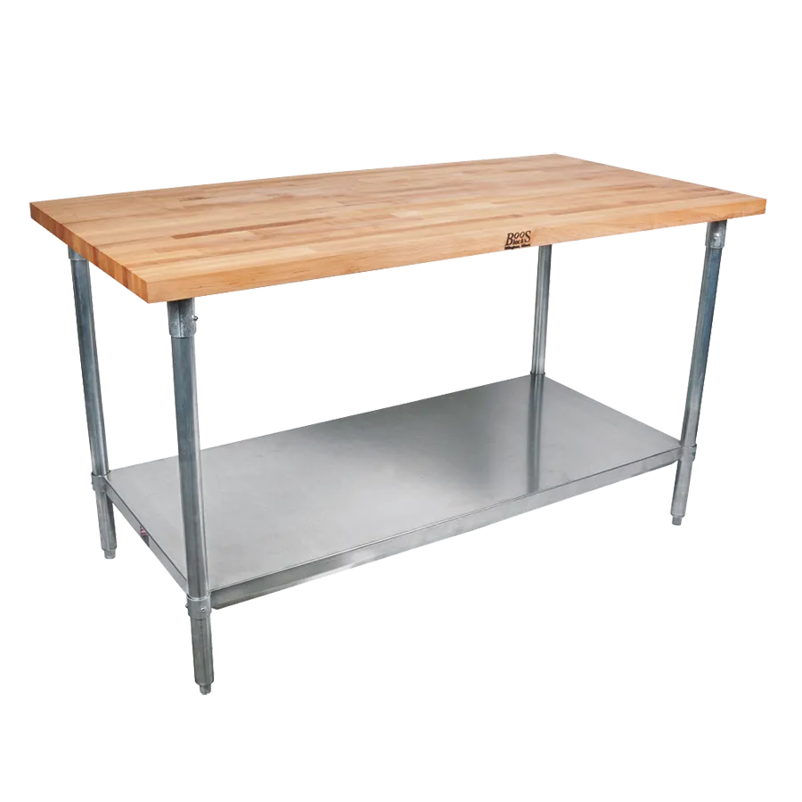 Transform your service with cutting-edge solutions using the John Boos TNS01 Work Table with Wood Top. This work table is designed to enhance efficiency and productivity in a commercial restaurant setting. With its 36W x 24D x 35-34H overall size, it provides ample space for food preparation, making it ideal for busy kitchens. The 2-14 inch thick edge grain flat top is made of antimicrobial Northern Hard Rock Maple with a penetrating oil finish, ensuring durability and easy maintenance. The stainless steel adjustable undershelf, legs, and bullet feet add stability and strength to the table, allowing for heavy-duty use. NSF certified, this work table meets the highest standards of cleanliness and safety. Whether you need a sturdy surface for chopping ingredients or a reliable workstation for plating dishes, the John Boos TNS01 Work Table with Wood Top is the perfect addition to your commercial kitchen.