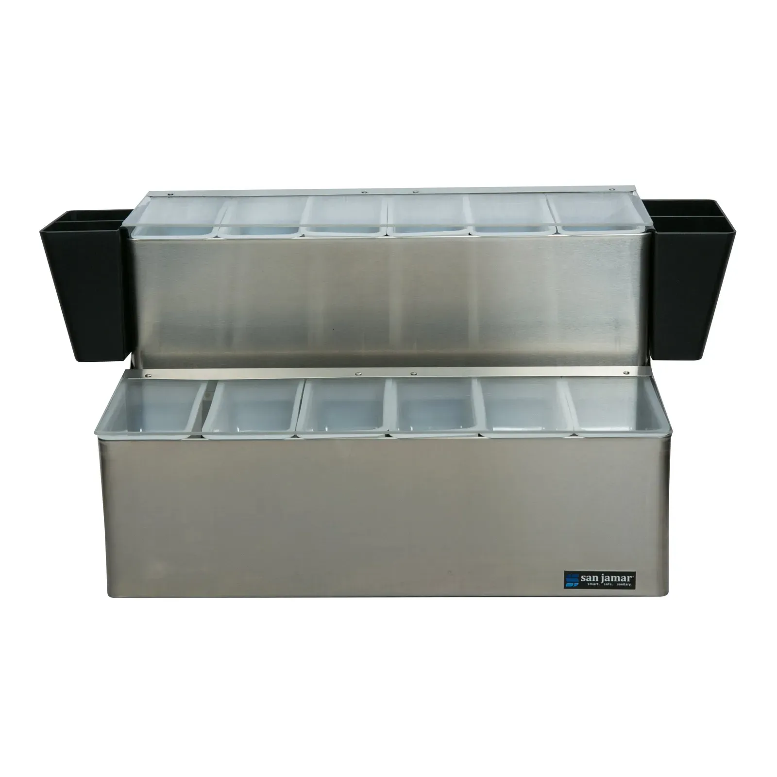 Elevate standards with the San Jamar B6766L Bar Condiment Holder. This two-tier garnish center is designed to meet the needs of commercial restaurants, ensuring efficiency and convenience. Made from 22-gauge 304 stainless steel, this condiment holder is durable and built to last. It includes 12 pints with plex lids, along with an ice liner and ice packs to keep your garnishes fresh and chilled. Plus, three extra quart inserts are included for added versatility. With its sleek design and ample storage capacity, this condiment holder is perfect for organizing and displaying a variety of condiments, from lemons and limes to olives and cherries. Whether you're running a busy bar or a bustling restaurant, the San Jamar B6766L Bar Condiment Holder is a must-have for any commercial kitchen.