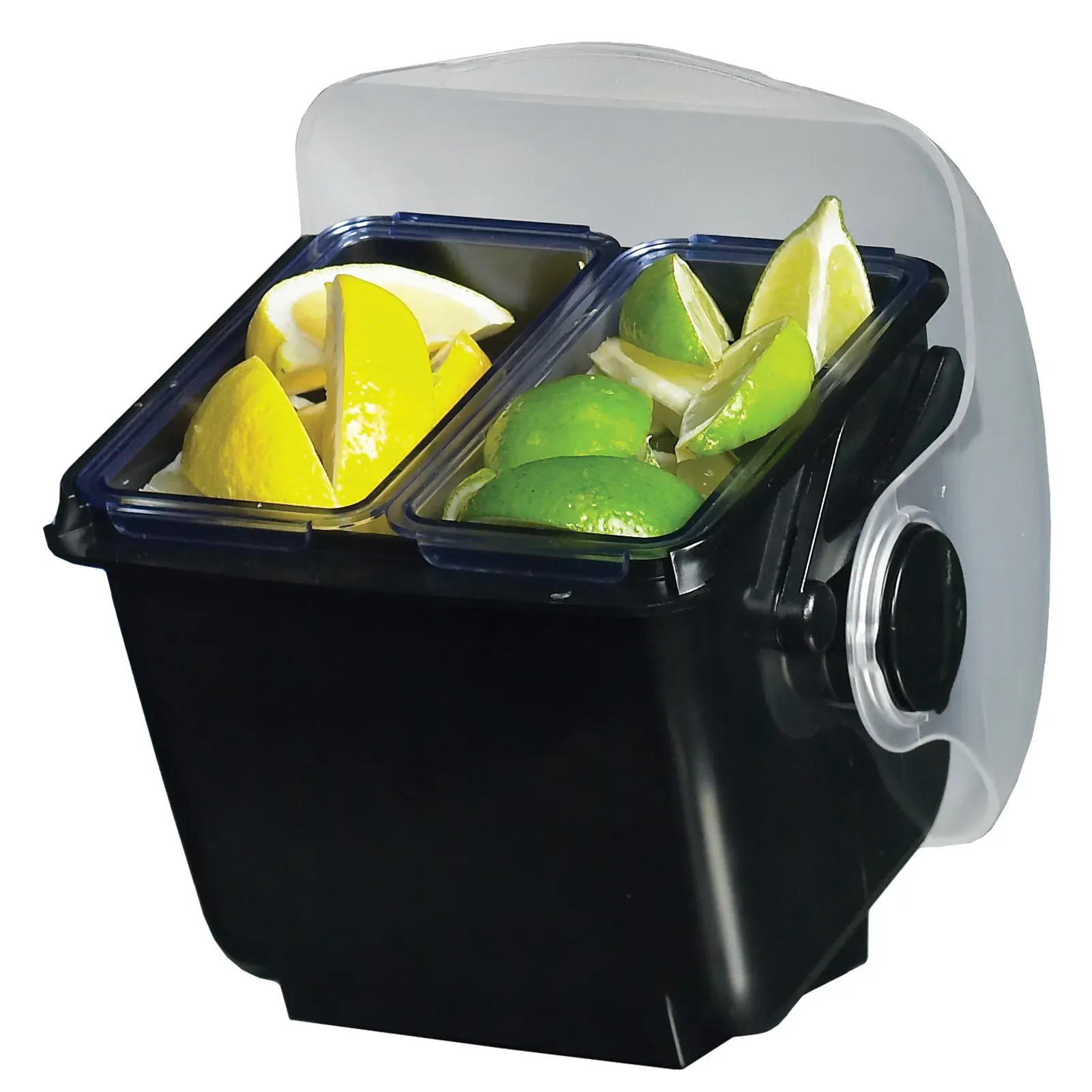 Upgrade equipment with the San Jamar BD2003 Bar Condiment Holder. This mini dome condiment center is perfect for commercial restaurant use. With its semi-transparent polycarbonate domed cover, you can easily see the condiments inside while keeping them fresh and protected. The black polycarbonate base adds a sleek and professional look to any bar or countertop. The holder holds two 1 pt. standard trays, providing ample space for a variety of condiments. It comes with two end caps and one connector, making it easy to customize and expand your condiment station. The BD2003 is NSF certified, ensuring it meets the highest standards of food safety and sanitation. Upgrade your condiment organization with the San Jamar BD2003 Bar Condiment Holder and enhance the efficiency and presentation of your restaurant.