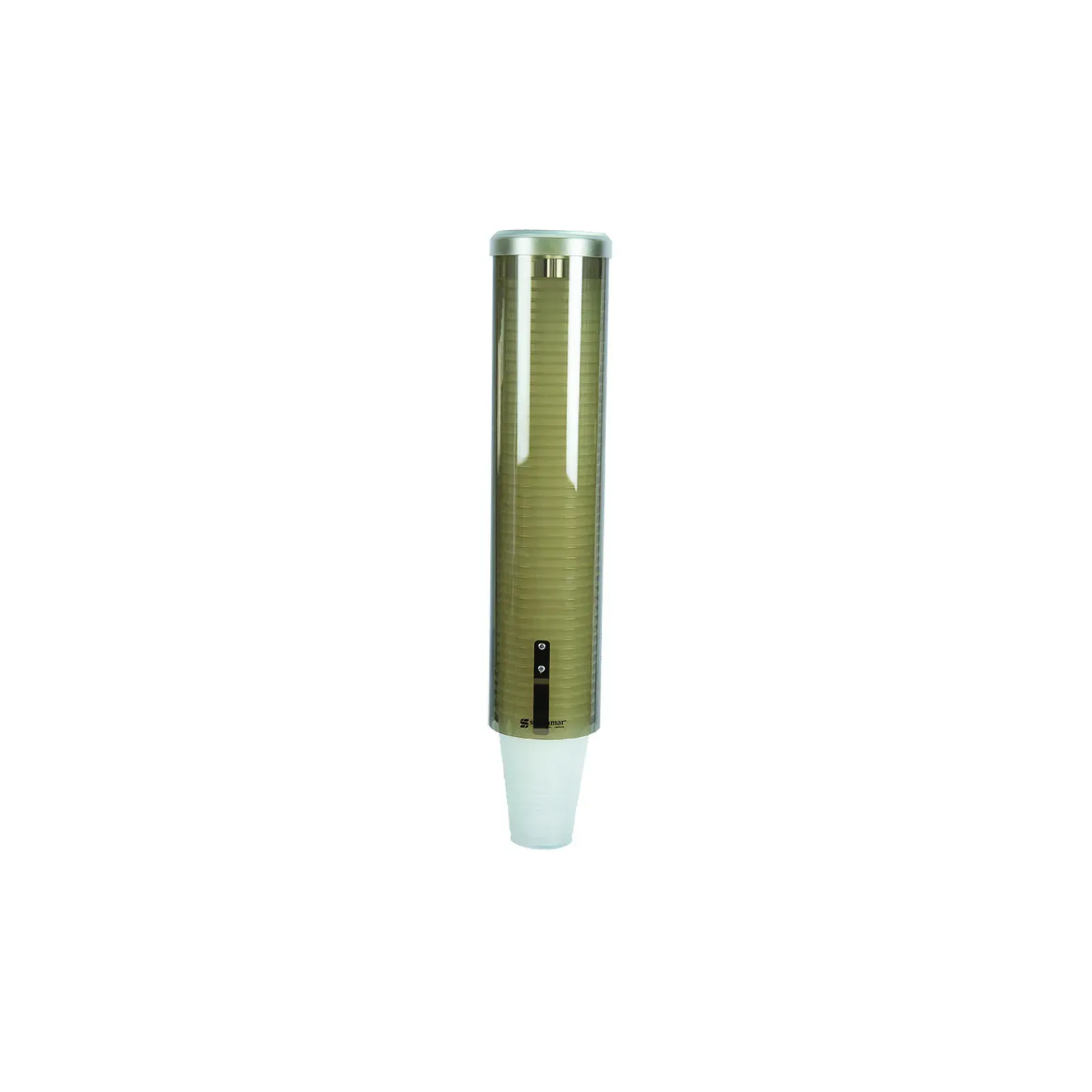 Maximize efficiency with the San Jamar C3260TBR Cup Dispenser. This top-loading, self-adjusting dispenser is designed for commercial restaurant use, making it the perfect addition to any foodservice establishment. With a 16-inch long tube, it can accommodate 4-1/2 to 7 oz. cone cups or 6 to 12 oz. flat bottom cups with a rim diameter of 2-3/4" to 3-3/8". The impact-resistant plastic construction ensures durability, while the translucent bronze color adds a touch of elegance to your beverage station. The dispenser is wall-mounted, saving valuable counter space and keeping cups easily accessible for your staff and customers. Trust San Jamar, a reputable vendor in the industry, to deliver a high-quality cup dispenser that meets the demands of your busy restaurant.
