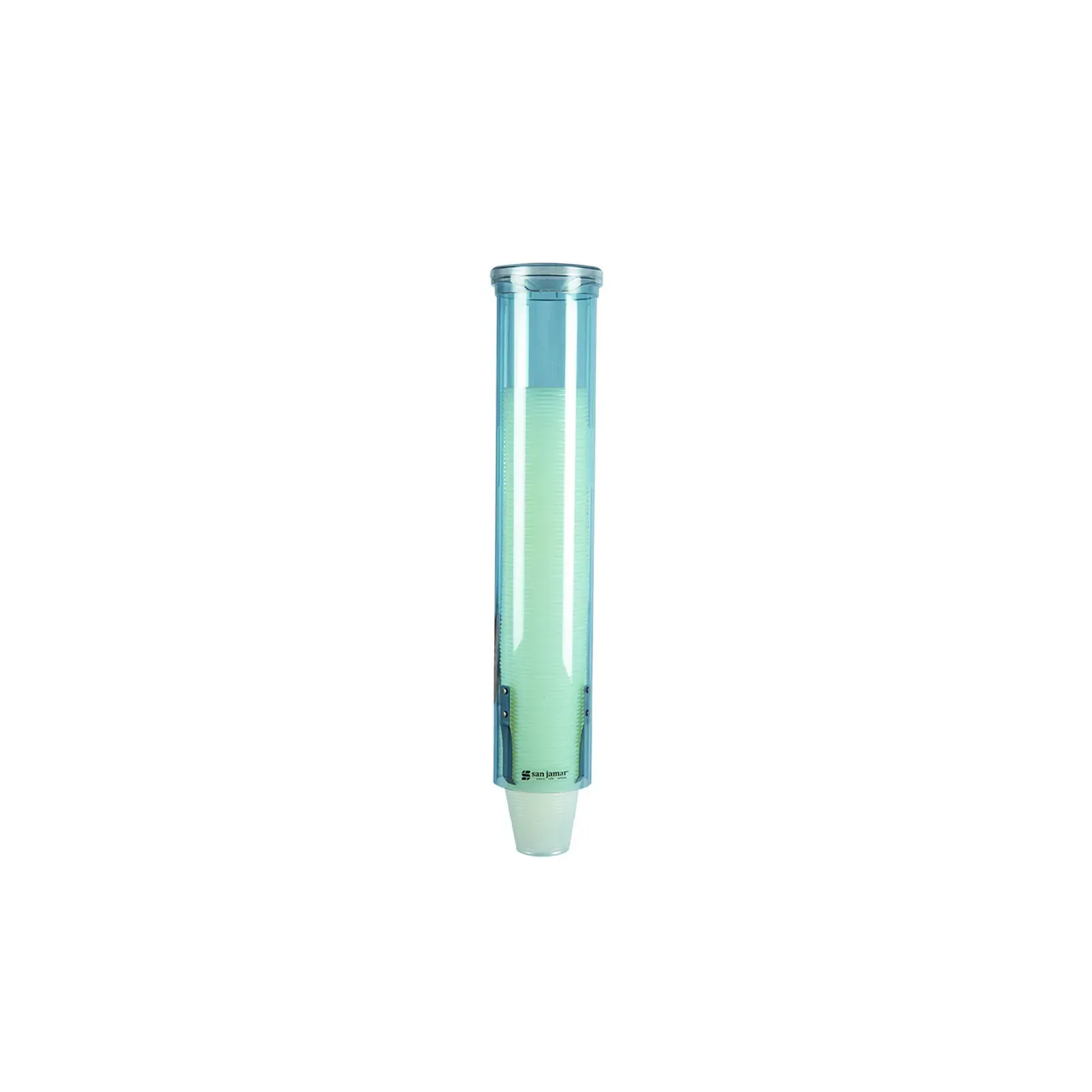 Introducing the San Jamar C4160TBL Cup Dispenser, Wall Mount, a must-have for commercial restaurants looking to foster innovation and efficiency. This high-impact plastic dispenser is designed for small water cups, making it perfect for quick and easy access in busy dining areas. The top-loading, pull-type design ensures a smooth and hassle-free cup dispensing experience, while the transparent flip cover allows for easy monitoring of cup levels. With a tube length of 16 inches, this dispenser can accommodate 3 to 4-1/2 oz. cone cups or 3 to 5 oz. flat bottom cups with a rim diameter of 2-1/4" to 2-7/8". Its arctic blue color adds a touch of style to any restaurant decor. Upgrade your restaurant's cup dispensing system with the San Jamar C4160TBL Cup Dispenser, Wall Mount.