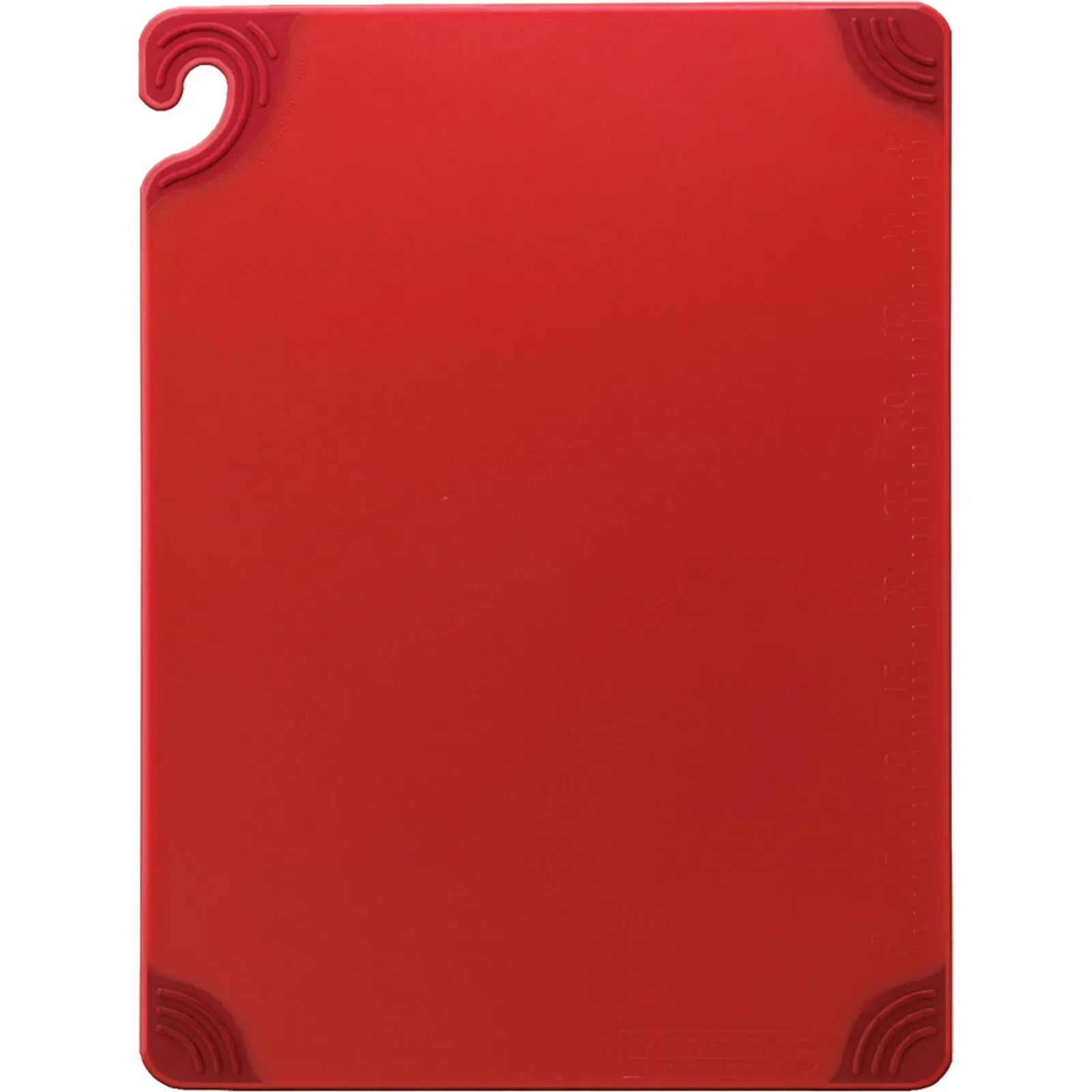 Elevate reliability with the San Jamar CBG912RD Cutting Board. Designed specifically for commercial restaurant use, this plastic cutting board is a must-have for any professional kitchen. The 9" x 12" x 3/8" size provides ample space for slicing, dicing, and chopping ingredients, while the anti-slip grip corners ensure stability during use. The integrated ruler allows for precise measurements, saving time and effort. With a food safety hook and dishwasher-safe design, this cutting board is easy to clean and maintain, promoting a hygienic cooking environment. Made from durable co-polymer material, it can withstand the demands of a busy kitchen. The vibrant red color adds a pop of personality to your workspace, while the NSF certification guarantees its quality and safety. Trust San Jamar for reliable, high-quality kitchen essentials.