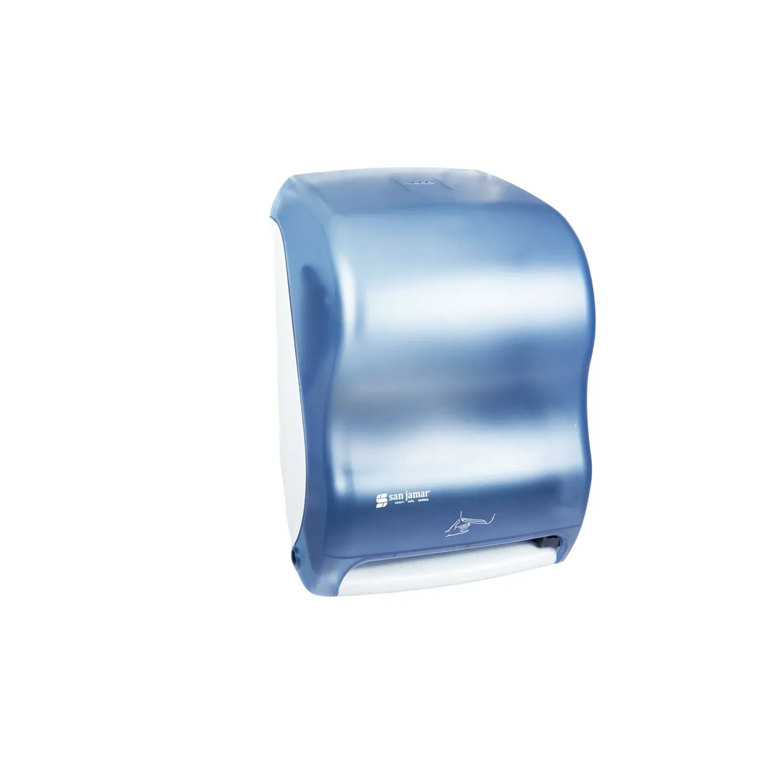 Upgrade equipment with the San Jamar T1400TBL Paper Towel Dispenser. This smart system classic dispenser is designed for commercial restaurant use, providing a touch-less and hygienic solution for hand drying. With its IQ sensor and self-adjusting sensing field, it ensures efficient and reliable paper dispensing. The dispenser holds one 8-inch wide roll with an 8.5-inch diameter and four stub rolls, making it perfect for high-traffic areas. It offers three selectable paper lengths and dispensing delays, allowing for customizable usage. The durable break-resistant plastic construction ensures long-lasting performance, while the translucent arctic blue design adds a modern touch to any restroom. The dispenser can be wall-mounted and comes with a lock for added security. Upgrade your restaurant's restroom with the San Jamar T1400TBL Paper Towel Dispenser for a convenient and efficient hand drying solution.