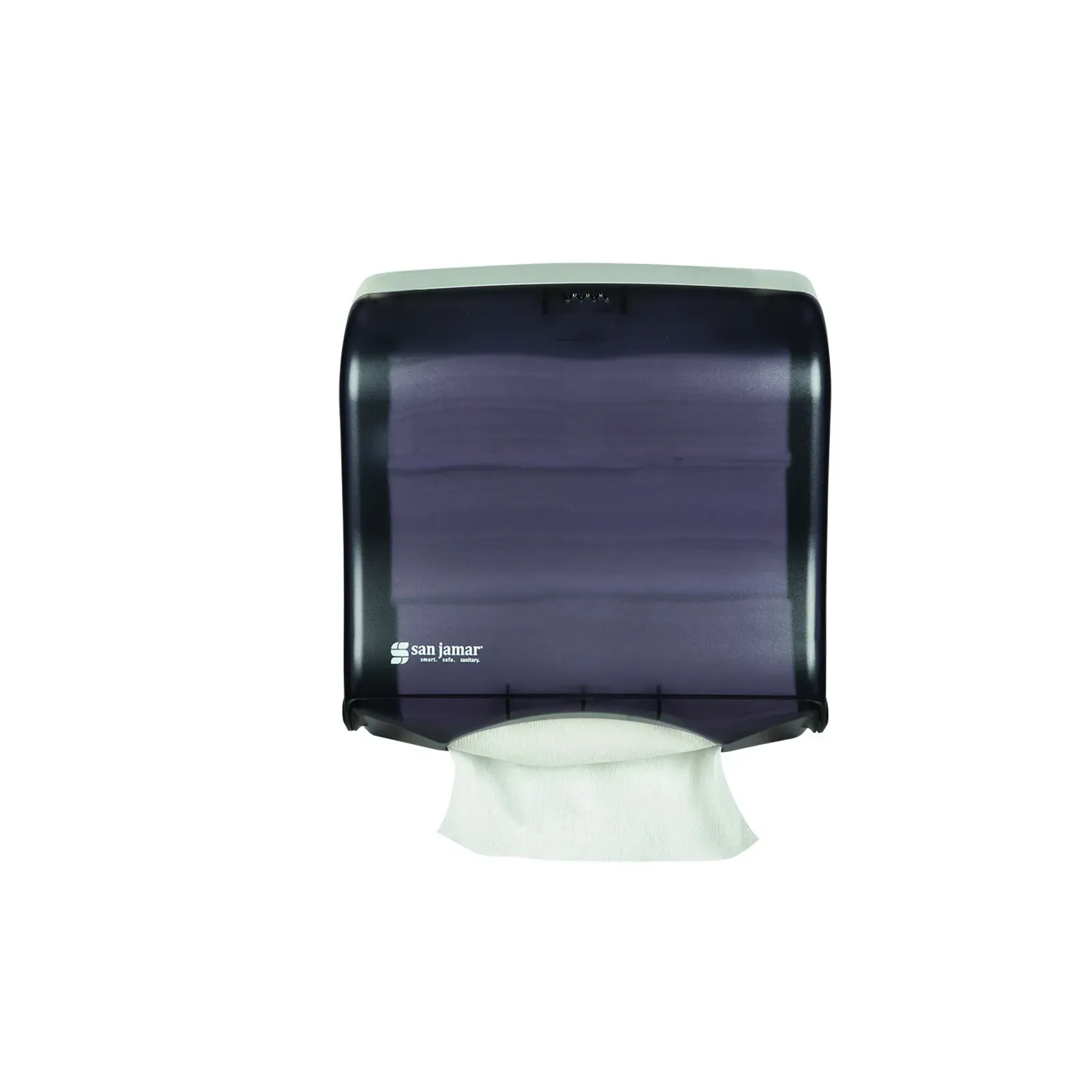 Introducing the San Jamar T1755TBK Paper Towel Dispenser, the perfect addition to any commercial restaurant seeking to foster sustainability. This compact dispenser, measuring 11-1/2"W x 6"D x 11-1/2"H, is designed to hold 240 C-fold or 400 multifold towels, making it ideal for high-traffic areas. Crafted from durable, impact-resistant plastic in a sleek translucent black pearl finish, this dispenser not only adds a touch of elegance to your establishment but also ensures long-lasting performance. The lock and Present System provide added security, preventing theft and reducing waste. With San Jamar's commitment to quality and innovation, you can trust that this dispenser will meet the demands of your busy restaurant. Upgrade your restroom facilities with the San Jamar T1755TBK Paper Towel Dispenser and experience the convenience and efficiency it brings.