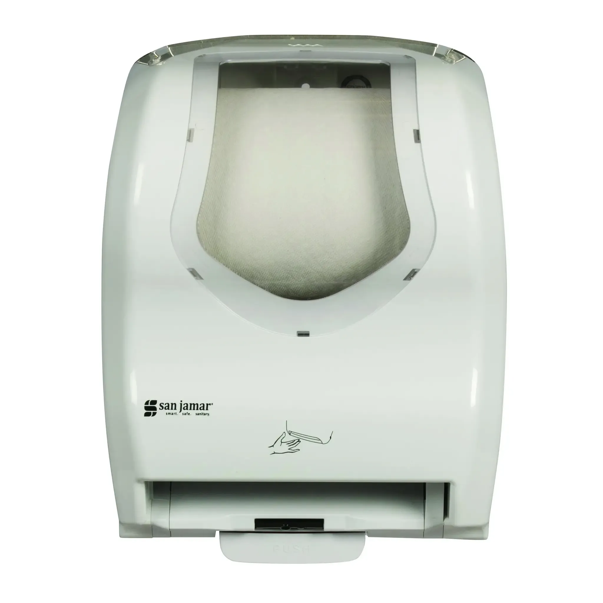 Introducing the San Jamar T8370WHCL Paper Towel Dispenser, the perfect addition to any commercial restaurant setting. This Summit Hybrid Classic Towel Dispenser is designed to optimize functionality, ensuring a seamless experience for both staff and customers. With its touchless operation and IQ Sensor technology, this dispenser offers a hygienic solution for hand drying. The dispenser holds one 8" wide roll, providing ample paper towel supply for busy restaurant environments. Plus, with three selectable paper lengths and dispensing delays, you can customize the dispenser to meet your specific needs. The manual option ensures continuous operation even when batteries are low. Made of durable plastic, this dispenser is built to withstand the demands of a commercial kitchen. Trust San Jamar, a reputable vendor in the industry, to deliver a high-quality product that enhances efficiency and cleanliness in your restaurant.