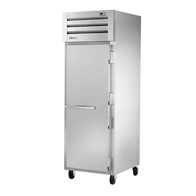 Achieve kitchen supremacy with the True Manufacturing STR1R-1S-HC Refrigerator, Reach-In. This top-of-the-line refrigerator is designed to meet the demanding needs of commercial restaurants. With its stainless steel construction, including a stainless steel door with lock and cam-lift hinges, this refrigerator is built to withstand the rigors of a busy kitchen. The digital temperature control ensures precise temperature management, while the LED interior lights provide excellent visibility of the contents. The 5" castors make it easy to move the refrigerator for cleaning or repositioning. Made in the USA and ENERGY STAR certified, this refrigerator not only delivers exceptional performance but also helps reduce energy consumption. With its spacious one-section design and interior kit, this True Manufacturing refrigerator offers ample storage space for all your ingredients, ensuring that your kitchen runs smoothly and efficiently. Upgrade your restaurant's refrigeration capabilities with the True Manufacturing STR1R-1S-HC Refrigerator, Reach-In.