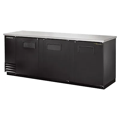 Deliver food perfection with the True Manufacturing TBB-4-HC Back Bar Cabinet. This three-section cooler is designed to meet the demands of a busy commercial restaurant. With a capacity to hold 152 six-packs or 4 half kegs, this cooler ensures you never run out of cold beverages for your customers. The condensing unit is conveniently located on the left side, allowing for easy access and maintenance. The stainless steel top provides a durable and hygienic surface for preparing drinks. The three full doors come with locks, ensuring the security of your valuable inventory. LED interior lights illuminate the contents, making it easy to find what you need. The galvanized interior with a stainless steel floor is easy to clean and maintain. The black vinyl exterior adds a sleek and professional look to your establishment. With its ENERGY STAR certification and use of R290 Hydrocarbon refrigerant, this back bar cabinet is not only efficient but also environmentally friendly. Trust True Manufacturing to deliver the quality and reliability your restaurant needs.