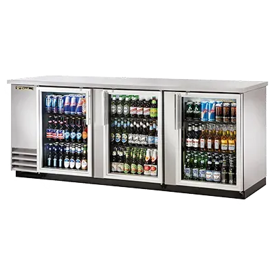 Cook with confidence and flair with the True Manufacturing TBB-4G-S-HC-LD Back Bar Cabinet. This three-section cooler is designed to meet the needs of a busy commercial restaurant. With a capacity to hold 152 six-packs or 4 half kegs, you'll never run out of cold beverages for your customers. The condensing unit is conveniently located on the left side, allowing for easy access and maintenance. The stainless steel top and glass doors with locks not only provide durability but also give your establishment a sleek and professional look. The LED interior light illuminates the contents, making it easy to find what you need. The galvanized interior with a stainless steel floor ensures easy cleaning and hygiene. Made in the USA and ENERGY STAR certified, this back bar cabinet is not only reliable but also energy-efficient. Upgrade your restaurant with the True Manufacturing TBB-4G-S-HC-LD Back Bar Cabinet and elevate your beverage service to the next level.