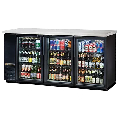 Craft culinary wonders with the True Manufacturing TBB-24-72G-HC-LD Back Bar Cabinet. This three-section cooler is designed to meet the demands of a busy commercial restaurant. With a capacity to hold 105 six-packs or 3 half kegs, it ensures you never run out of chilled beverages. The condensing unit on the left side allows for easy access and maintenance. The stainless steel top provides a durable and hygienic work surface, while the galvanized interior with a stainless steel floor ensures easy cleaning. The three glass doors, equipped with locks, not only showcase your selection but also keep it secure. The LED interior light illuminates the contents, making it easy to find what you need. The black vinyl exterior adds a sleek and professional look to your establishment. Made in the USA, this back bar cabinet is UL EPH Classified and uses R290 Hydrocarbon refrigerant, making it an eco-friendly choice. Upgrade your restaurant with the True Manufacturing TBB-24-72G-HC-LD Back Bar Cabinet and elevate your beverage service to new heights.