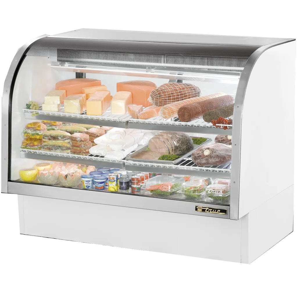 Equip your kitchen for success with the True Manufacturing TCGG-60-LD Display Case. This refrigerated deli case is designed to meet the needs of commercial restaurants, ensuring that your food stays fresh and visually appealing. The curved glass design not only enhances the presentation of your deli items but also provides easy access for customers. With two sliding Low-E thermal glass rear doors, you can effortlessly restock and organize your products. The four adjustable white wire shelves allow for flexible storage options, accommodating items of various sizes. The LED interior lights illuminate your products, making them even more enticing to customers. Made in the USA, this display case is built to last with its durable stainless steel floor and coved corners. Trust True Manufacturing to deliver high-quality equipment that enhances the efficiency and aesthetics of your restaurant.