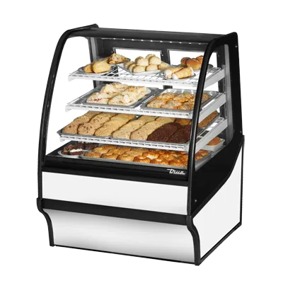 Unleash culinary creativity with the True Manufacturing TDM-DC-36-GE/GE-S-W Display Case. Designed specifically for non-refrigerated bakery items, this display merchandiser is a must-have for any commercial restaurant. With its curved glass front and glass sides, it offers a clear view of your delectable treats, enticing customers to indulge. The two rear sliding glass doors provide easy access for staff while maintaining the perfect temperature inside. The three tiered levels of adjustable white PVC coated wire shelves allow for versatile display options, accommodating a variety of baked goods. The LED interior lighting illuminates your products, making them even more enticing to customers. Made in the USA with a stainless steel exterior and white powder coated interior, this display case is not only durable but also easy to clean. Trust True Manufacturing to deliver high-quality equipment that enhances your bakery's presentation and drives sales.