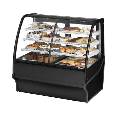 Experience kitchen innovation with the True Manufacturing TDM-DZ-48-GE/GE-S-S Display Case. This dual-zone merchandiser is perfect for commercial restaurants looking to showcase their products in style. The two rear sliding glass doors provide easy access for staff while maintaining the temperature inside. The three tiered levels of adjustable chrome plated wire shelves allow for flexible display options, accommodating a variety of products. The LED interior lighting illuminates your items, making them even more enticing to customers. Made in the USA with a stainless steel exterior and interior, this display case is not only durable but also easy to clean. With its self-contained refrigeration system and R290 Hydrocarbon refrigerant, this display case is energy-efficient and environmentally friendly. Trust True Manufacturing for quality and reliability in your commercial kitchen.