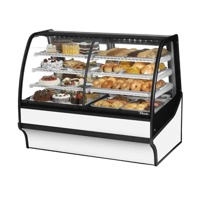 Elevate your dining experience with the True Manufacturing TDM-DZ-59-GE/GE-S-W Display Case. This dual-zone merchandiser is perfect for commercial restaurants, offering both dry and refrigerated storage options. With a spacious 59-1/4" width, this display case provides ample room for showcasing your delectable treats. The curved glass front and glass sides create an elegant and enticing display, while the two rear sliding glass doors allow for easy access and restocking. The three tiered levels of adjustable white PVC coated wire shelves provide flexibility in organizing your products. LED interior lighting illuminates your items, making them even more appealing to customers. Made in the USA, this display case features a stainless steel exterior and a white powder coated interior for durability and easy cleaning. With its R290 Hydrocarbon refrigerant and 1/4 HP compressor, this display case ensures efficient and reliable cooling. Trust True Manufacturing to deliver quality and functionality for your restaurant needs.