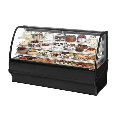 Fuel your restaurant's success with the True Manufacturing TDM-R-77-GE/GE-S-S Display Case. This refrigerated bakery display merchandiser is designed to showcase your delectable treats and entice customers with its sleek and modern design. The curved glass front and glass sides provide a clear view of your products from all angles, while the two rear sliding glass doors make it easy to access and restock items. With three tiered levels of adjustable chrome plated wire shelves, you can customize the display to suit your needs. The LED interior lighting illuminates your baked goods, making them even more enticing to customers. Made in the USA with a stainless steel exterior and interior, this display case is not only durable but also easy to clean. The self-contained refrigeration system and R290 Hydrocarbon refrigerant ensure optimal temperature control, keeping your pastries fresh and delicious. Trust True Manufacturing to deliver quality and reliability for your commercial bakery.