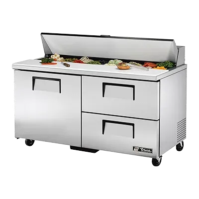 Enhance the heart of your restaurant with the True Manufacturing TSSU-60-16D-2-HC Refrigerated Counter, Sandwich / Salad Unit. This top-of-the-line unit is designed to meet the demanding needs of a commercial restaurant. With its stainless steel insulated cover and aluminum interior with a stainless steel floor, this unit ensures durability and easy cleaning. The 11-3/4" cutting board provides ample space for food preparation, while the (16) 1/6 size poly pans allow for efficient organization and storage of ingredients. The unit also features a spacious door and two shelves, as well as two drawers that can accommodate 6"D pans (not included). Equipped with 5" castors, this unit is easy to move and position wherever it's needed. With its R290 Hydrocarbon refrigerant and 1/3 HP compressor, this unit provides reliable cooling while being energy-efficient. Trust True Manufacturing, a reputable brand known for its quality and reliability, and invest in the TSSU-60-16D-2-HC Refrigerated Counter, Sandwich / Salad Unit for your restaurant's success.