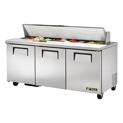 Optimize your kitchen efficiency with the True Manufacturing TSSU-72-18-HC Refrigerated Counter, Sandwich / Salad Unit. This top-of-the-line unit is designed to meet the demands of a busy commercial restaurant. With its stainless steel insulated cover and aluminum interior with a stainless steel floor, this unit ensures durability and easy cleaning. The unit features (18) 1/6 size poly pans, perfect for storing and organizing your sandwich and salad ingredients. The 11-3/4" cutting board provides a convenient workspace for food preparation. The three full doors and six shelves offer ample storage space for your ingredients, while the 5" castors allow for easy mobility. The TSSU-72-18-HC is also energy-efficient, using R290 Hydrocarbon refrigerant and a 1/2 HP compressor. Made in the USA and UL EPH Classified, this True Manufacturing unit is a reliable and efficient addition to any commercial kitchen.
