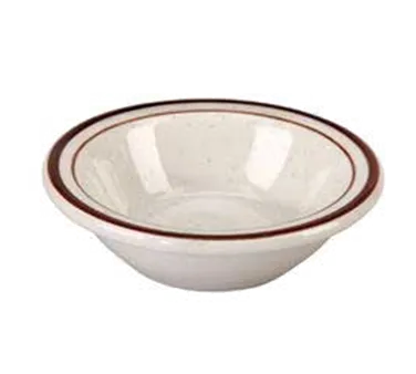 Craft a seamless dining presentation with Vertex China, CRV-11, China, Bowl, 0 - 8 oz. This fruit bowl from the Caravan Collection is perfect for commercial restaurant use. Made of vitrified china, it is microwave and dishwasher safe, ensuring convenience and durability. The round shape and narrow rim add a touch of elegance to any table setting. With a capacity of 4-3/4 oz., it is ideal for serving individual portions of fruits, desserts, or appetizers. The brown speckled design and double band detail enhance the bowl's visual appeal, making it a stylish addition to your restaurant's tableware collection. Elevate your dining experience with the Vertex China CRV-11 fruit bowl, offering both functionality and aesthetic appeal for your commercial restaurant needs.