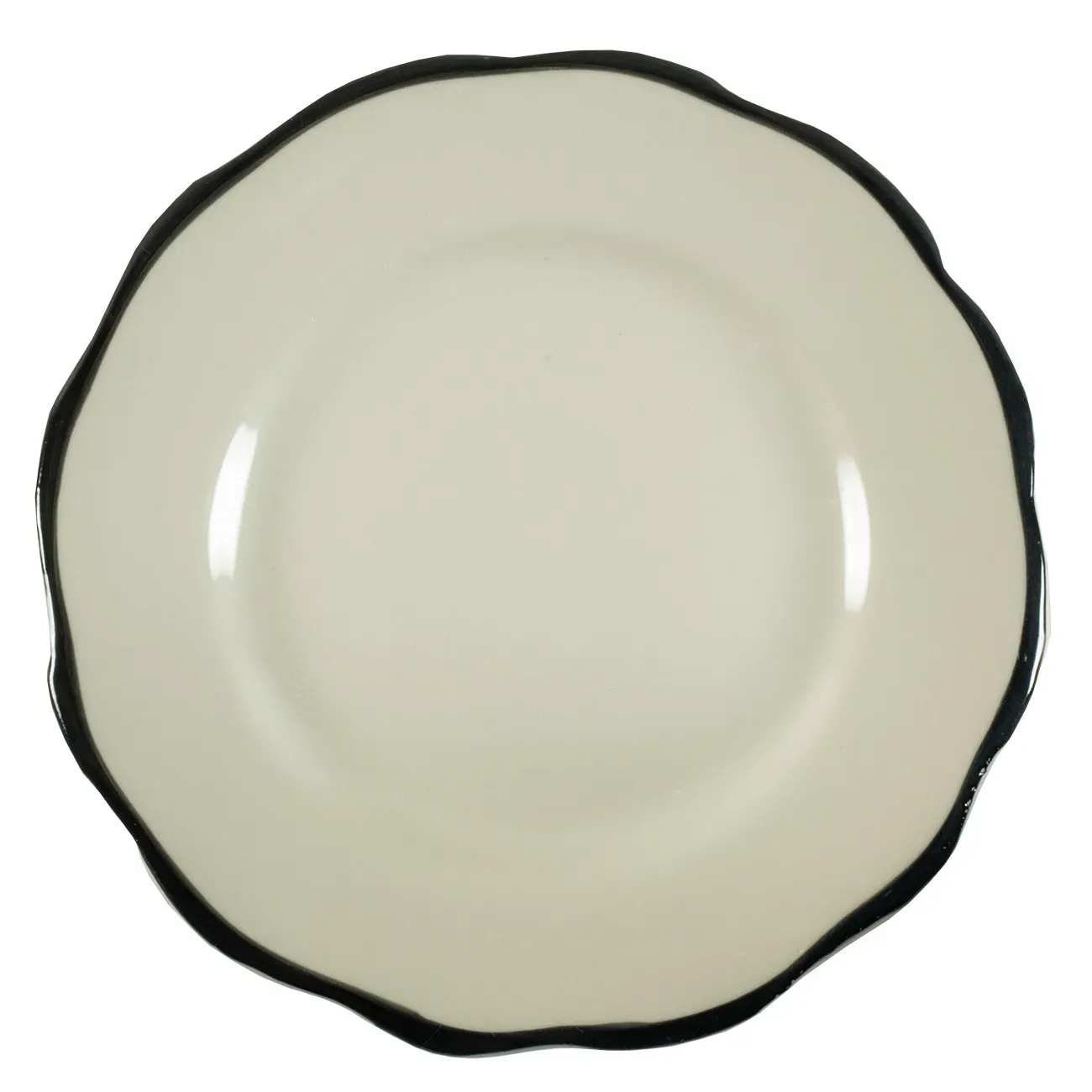 Enhance your restaurant's visual appeal with the Vertex China, CSCB-6 Plate. This round, 6-3/8" dia. plate from the California Scalloped Collection features a sleek black line design that adds a touch of sophistication to any table setting. Made from vitrified china, this plate is scratch-resistant, ensuring durability and longevity in a busy commercial restaurant environment. It is also microwave and dishwasher safe, allowing for easy heating and cleaning. Whether you're serving appetizers, salads, or desserts, this plate is sure to impress your customers and elevate the overall dining experience. Invest in this versatile and visually appealing plate to enhance your restaurant's aesthetic and leave a lasting impression on your guests.