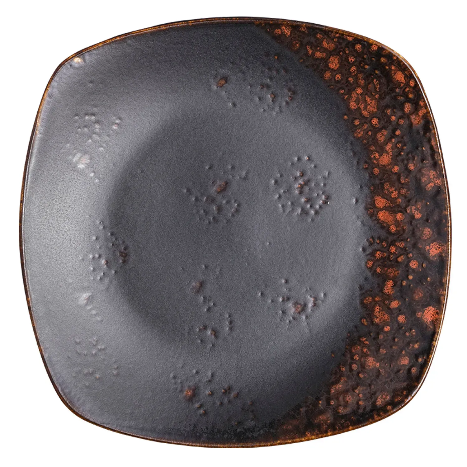 Enhance your restaurant's visual appeal with the Vertex China, LMC-S16 Plate. This stunning plate from the London Moonstone Collection is designed to elevate your dining experience. Hand-painted with a matte black/terra cotta reactive glaze, each plate is unique and adds a touch of elegance to any table setting. The fully glazed foot ensures durability and scratch resistance, making it perfect for busy commercial restaurants. Crafted with an aluminum oxide reinforced body, this plate is built to withstand the demands of a professional kitchen. The 10" x 10" square shape provides ample space for presenting your culinary creations in style. Made from premium porcelain, this plate exudes quality and sophistication. Elevate your dining experience with the Vertex China, LMC-S16 Plate.