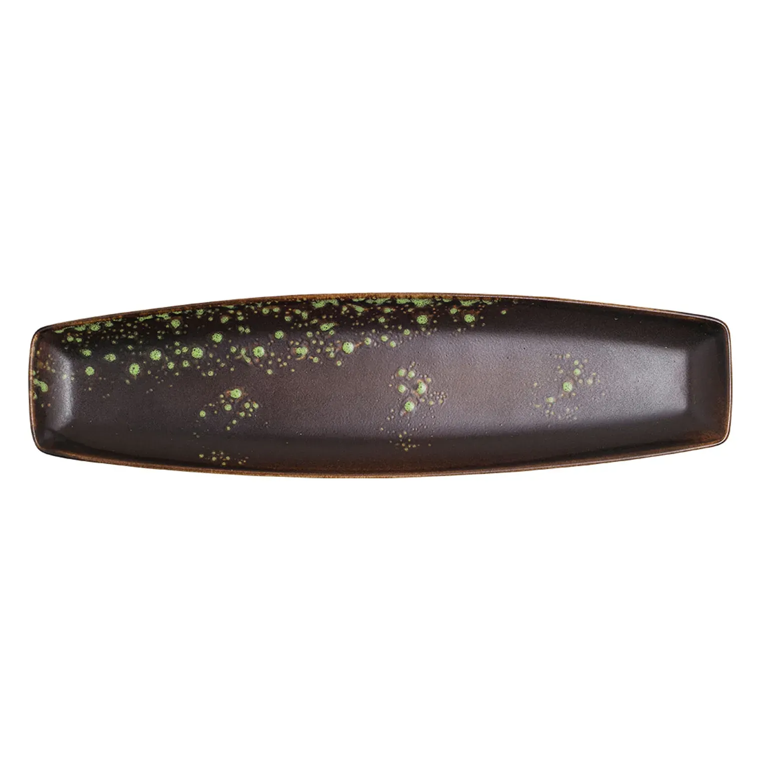 Craft a seamless dining presentation with the Vertex China, LMJ-014 Platter. This oblique/rectangular platter measures 13" x 3-1/2" and is hand-painted with a stunning matte black/jade reactive glaze from the Premium London Moonstone Collection. Its fully glazed foot and scratch-resistant, aluminum oxide reinforced body ensure durability and longevity, making it perfect for commercial restaurant use. The porcelain construction adds an elegant touch to any table setting, while the unique glaze creates a visually striking presentation. Whether you're serving appetizers, main courses, or desserts, the Vertex China, LMJ-014 Platter is designed to enhance the visual appeal of your culinary creations and impress your guests. Elevate your restaurant's dining experience with this exquisite platter.