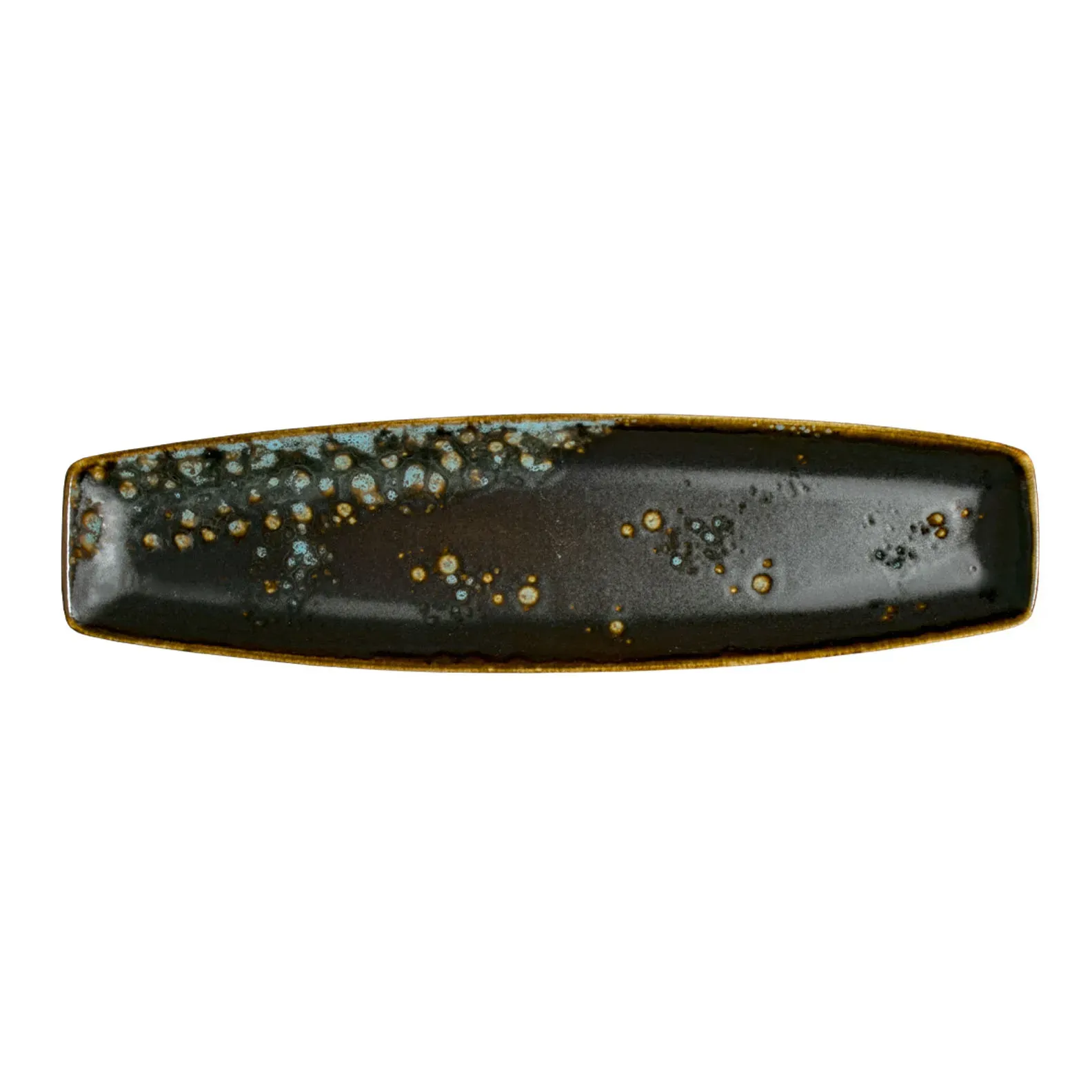 Enhance your restaurant's visual appeal with the Vertex China, LMS-014 Platter. This oblique/rectangular platter measures 13" x 3-1/2" and is hand-painted with a stunning matte black/sky blue reactive glaze. Its fully glazed foot and scratch-resistant, aluminum oxide reinforced body ensure durability and longevity, making it perfect for the demands of a commercial restaurant setting. The London Moonstone Collection adds a touch of elegance and sophistication to any table setting. Crafted from premium porcelain, this platter is not only visually appealing but also practical. Its large size allows for the presentation of a variety of dishes, from appetizers to main courses. Elevate your dining experience with the Vertex China, LMS-014 Platter.