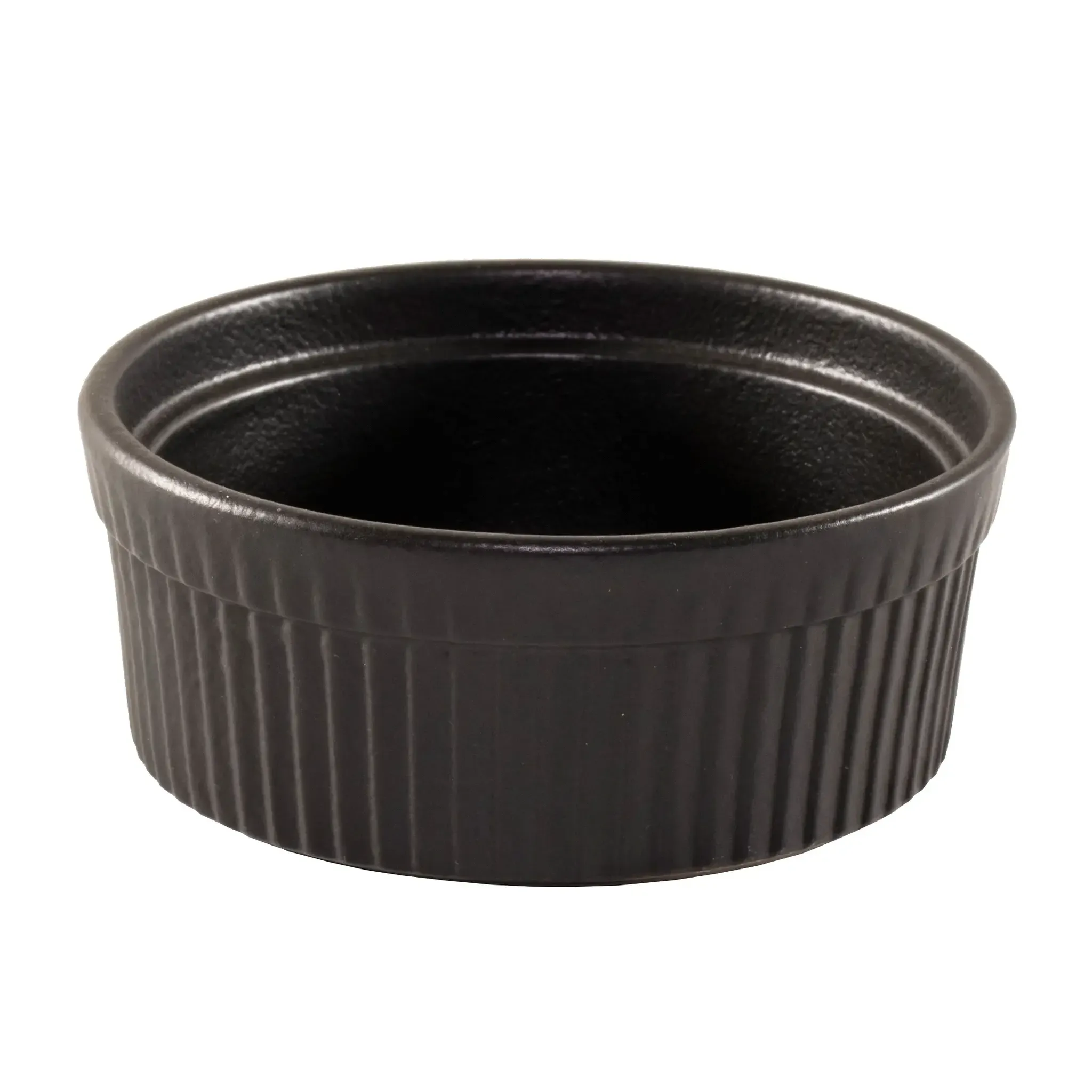 Simplify your tabletop presentation with Vertex China's OB-60 Souffle Bowl/Dish. Designed for commercial restaurant use, this premium porcelain bowl is perfect for serving souffles, desserts, and other delectable dishes. With a generous 10 oz. capacity and a 4-1/2" diameter, it provides ample space for your culinary creations. The round shape and fluted sides add an elegant touch to any table setting, while the matte black finish exudes sophistication and style. Crafted with scratch-resistant porcelain, this bowl is built to withstand the rigors of a busy restaurant kitchen. It is also microwave, oven, freezer, and dishwasher safe, ensuring convenience and versatility. Whether you're running a fine dining establishment or a casual eatery, the Vertex China OB-60 Souffle Bowl/Dish is a must-have addition to your restaurant's dinnerware collection.