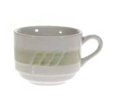 Simplify your restaurant tabletops with Vertex China, SAU-1S-G Cups. These 8 oz. cups are designed for commercial restaurant use, offering both functionality and style. Made from high-quality china, these cups are durable and stackable, making them easy to store and organize. The sculpted lines add a touch of elegance to any table setting, while the round shape and handle provide a comfortable grip for your customers. Part of the Sausalito Collection in the American Classics series, these cups feature the Harvest Water Colors design in Cilantro, adding a pop of color to your dining experience. Simplify your tabletops and enhance your customers' dining experience with Vertex China, SAU-1S-G Cups.