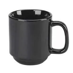 Simplify your tabletop presentation with the Vertex China, SM-BK Mug. This sleek and stylish mug is perfect for commercial restaurant use. With a capacity of 10 oz., it is ideal for serving hot beverages such as coffee, tea, or hot chocolate. The round shape and polished foot add a touch of elegance to any table setting, while the black color adds a modern and sophisticated look. The mug is designed with a convenient handle for easy gripping and serving. It is stackable, allowing for efficient storage and organization. Made by Vertex China, a trusted name in the industry, this mug is part of the American Classics Vista Collection. Upgrade your tabletop with the Vertex China, SM-BK Mug and impress your customers with its quality and style.