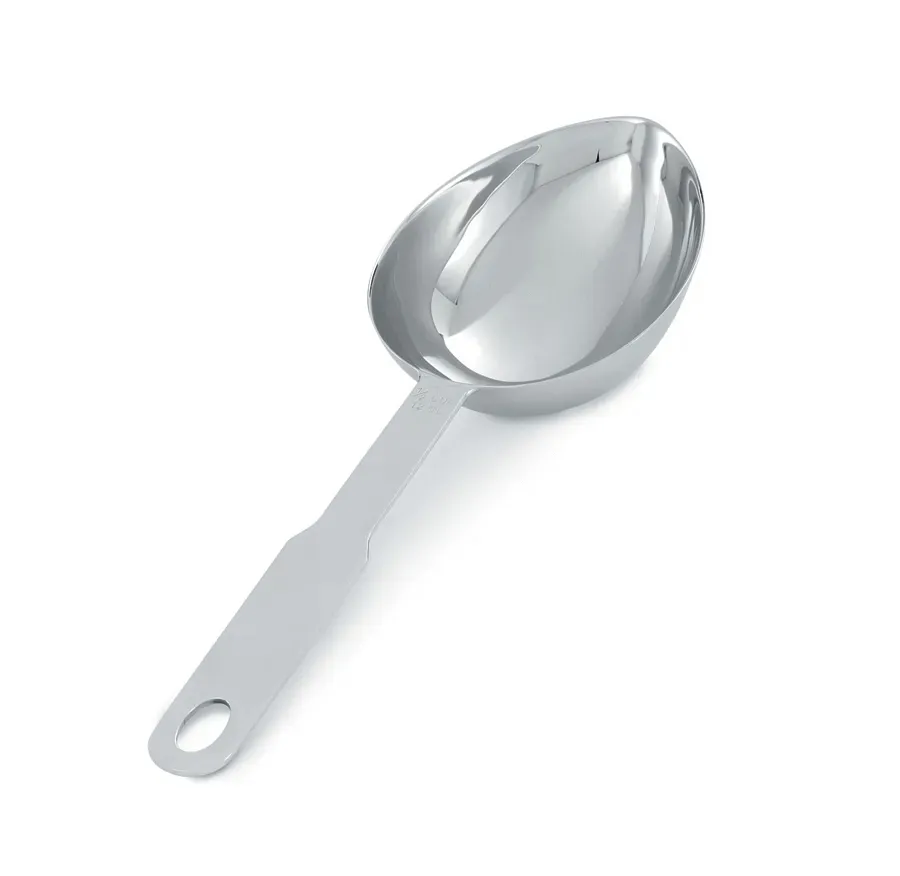 Improve your measuring accuracy with the Vollrath® ½-cup oval measuring scoop. Made of heavy-duty stainless steel, this scoop features a sleek one-piece construction that is easy to clean. The tapered oval bowl allows for easy pouring and prevents messes, while the long handle offers excellent mixing leverage and a comfortable grip. The capacity is stamped on the handle for quick identification, and the hanging hole at the end provides a convenient storage solution. Ideal for both wet or dry ingredients, this measuring scoop is a versatile addition to any kitchen.