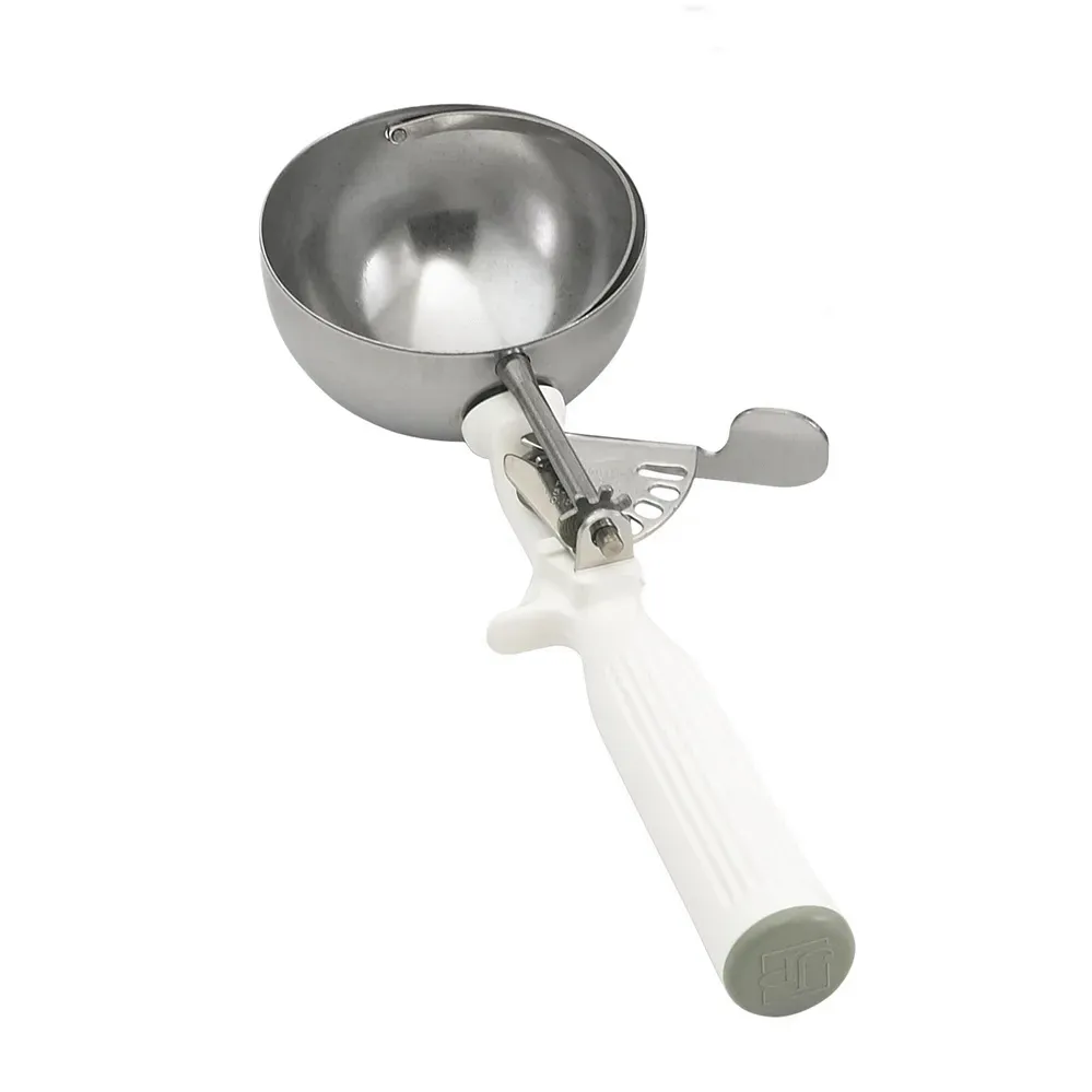 Equip your kitchen for success with the Vollrath, 47139, Disher, Standard Round Bowl. This high-quality disher is a must-have tool for any commercial restaurant. Made in the USA with 18-8 stainless steel, it is built to withstand the demands of a busy kitchen. The round bowl design and 5-1/3 oz. capacity make it perfect for portioning out consistent servings of ice cream, mashed potatoes, or cookie dough. The one-piece color-coded white plastic handle not only provides a comfortable grip but also features all-natural antimicrobial properties, ensuring food safety and preventing cross-contamination. With a limited lifetime warranty, you can trust in the durability and reliability of this disher. Whether you're running a bustling restaurant or a busy catering service, the Vollrath, 47139, Disher, Standard Round Bowl is the ideal tool to streamline your food preparation process and deliver consistent results every time.