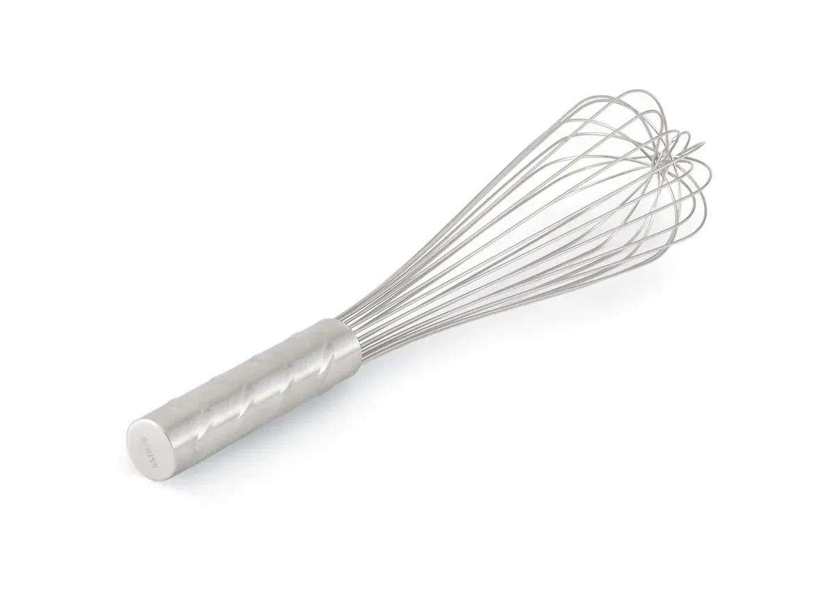 Designed for comfort, durability and longevity, the piano whip by Vollrath is a versatile tool. The fine wires, which are ideal for mixing or aerating thinner food products, are reinforced by a center wire, so they won't bend, twist or deform no matter how vigorously you whip. The round shape provides good coverage in round bowls, and integral nubs on the one-piece handle ensure a safe, comfortable grip and excellent control.