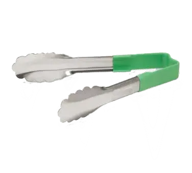 Maximize your food service potential with the Vollrath 4780670 Utility Tongs. These one-piece tongs are a must-have tool for any commercial restaurant. Made with high-quality stainless steel, these tongs are not only durable but also equipped with all-natural antimicrobial properties, ensuring a hygienic food handling experience. The green kool-Touch handle provides a comfortable grip and remains cool to the touch, even when used with hot foods. With a springless design and ergonomic handle, these tongs offer ease of use and precision control. They are heat resistant up to 180°F (82.1°C), making them perfect for handling hot dishes. Cleaning is a breeze as these tongs are dishwasher safe. Proudly made in the USA and NSF certified, the Vollrath Utility Tongs are backed by a Limited Lifetime Warranty. Enhance your kitchen efficiency and food safety with these reliable tongs.
