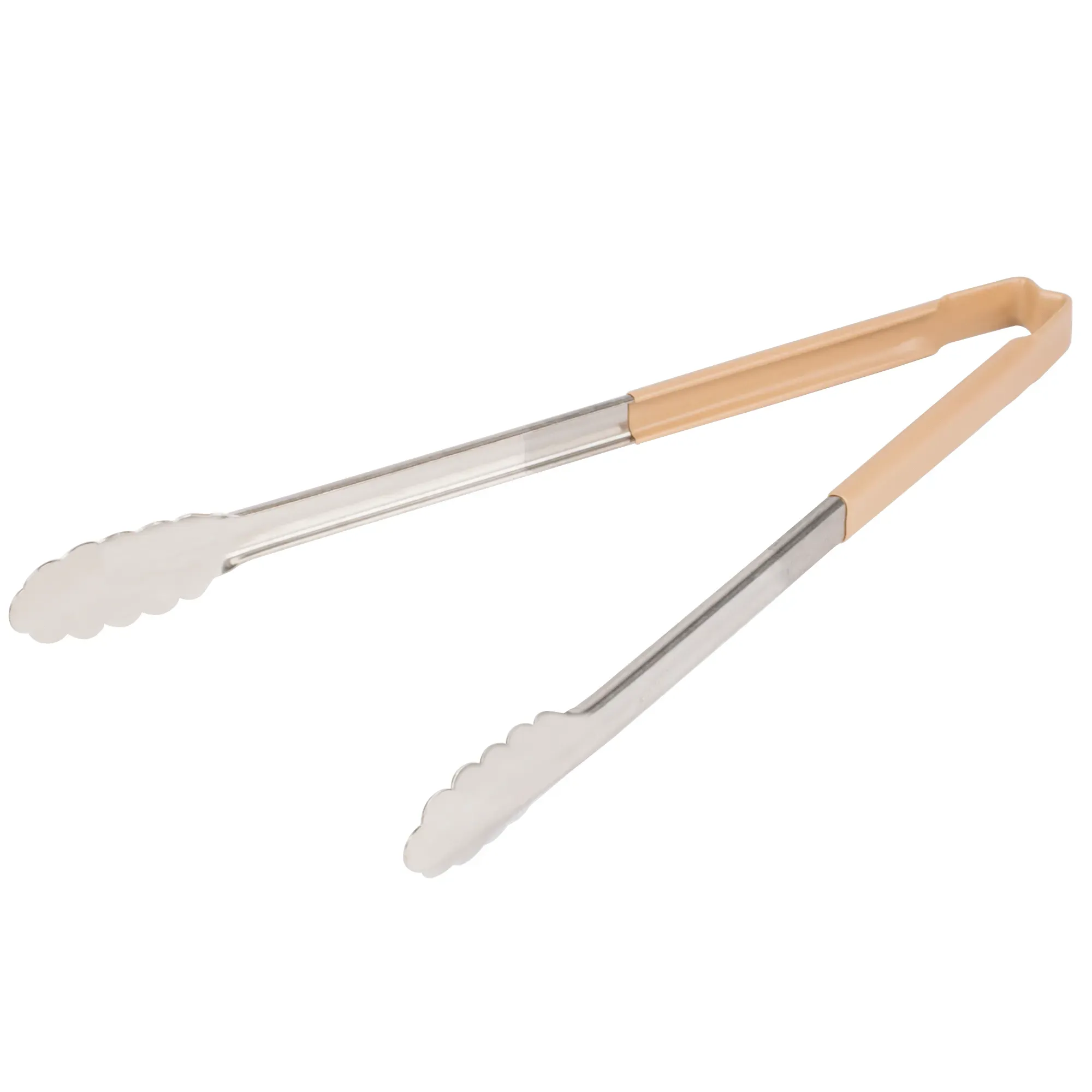 Offering outstanding durability, efficiency and versatility, the one-piece scalloped tongs by Vollrath are perfect for cooking and serving. Made of strong stainless steel, these tongs are fully functional up to 350°F and are sure to provide years of superior service. The springless design eliminates food traps and ensures easy cleaning, while the scalloped ends allow for a gentle, yet firm, grip on a wide range of food items. The insulated Kool-Touch handle is heat-resistant up to 180°F and color-safe up to 225°F. It creates a comfortable, cool grip and features all-natural antimicrobial properties that guard against harmful bacteria. And the tan color allows for quick identification and helps you maximize your kitchen’s HACCP program.