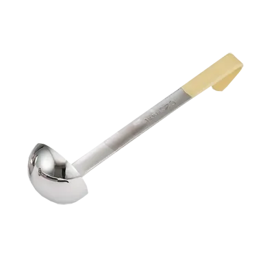 Introducing the Vollrath, 4980335, Ladle, Serving - the perfect tool to simplify restaurant operations. This ladle, equipped with all-natural antimicrobial properties, is a must-have for any commercial restaurant. Crafted from heavy-duty 18/8 stainless steel, this ladle is built to withstand the demands of a busy kitchen. The 14 ga 12-5/8" grooved hooked ivory Kool-Touch handle ensures a comfortable grip and prevents heat transfer, keeping your staff safe. The 18 ga 2-7/8" bowl dia with a mirror finish adds a touch of elegance to your presentation. With stamped capacity in ounces and milliliters on the front side of the handle, portion control becomes effortless. NSF certified and backed by the Jacobs Pride Collection, this ladle is not only durable but also meets the highest standards of hygiene. Simplify your restaurant operations with the Vollrath, 4980335, Ladle, Serving.
